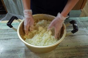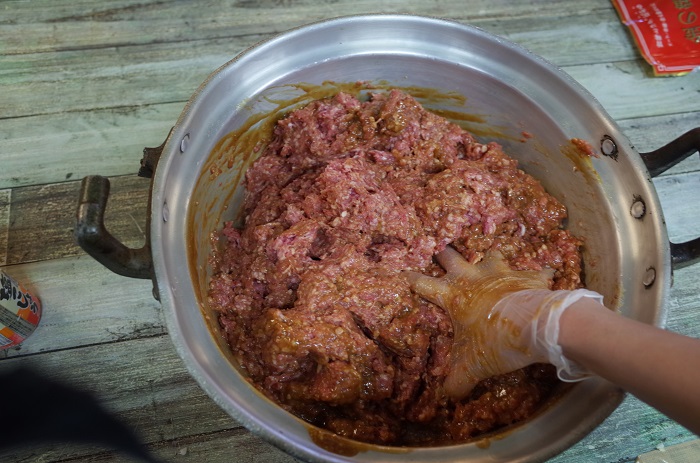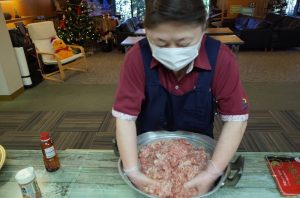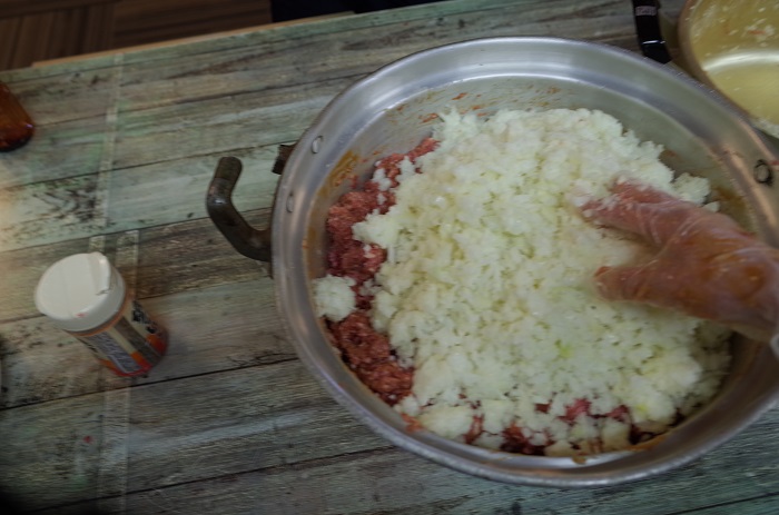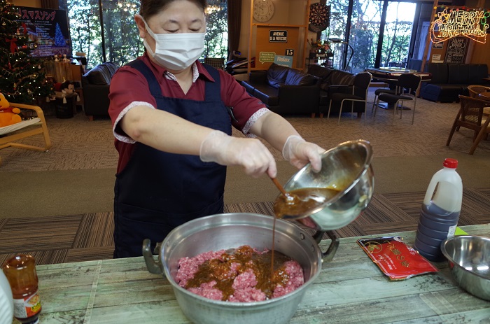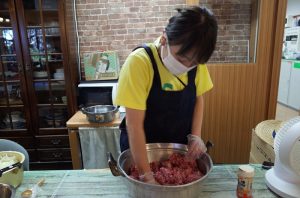 5キロのひき肉を混ぜるのはかなりの力が必要です。