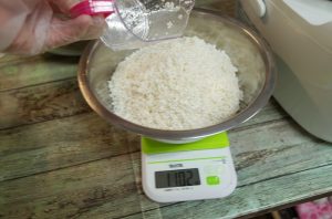 浸水した16合のもち米の重さを量り