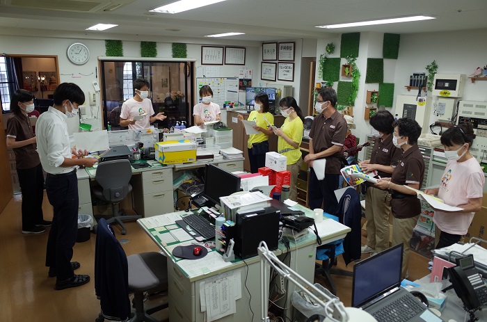 朝礼では出勤者全員が集まり今日の流れを確認。