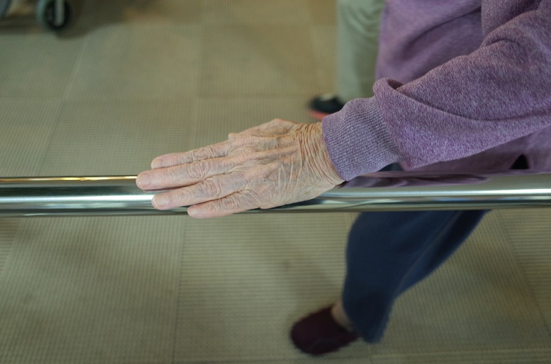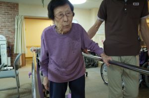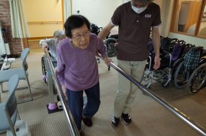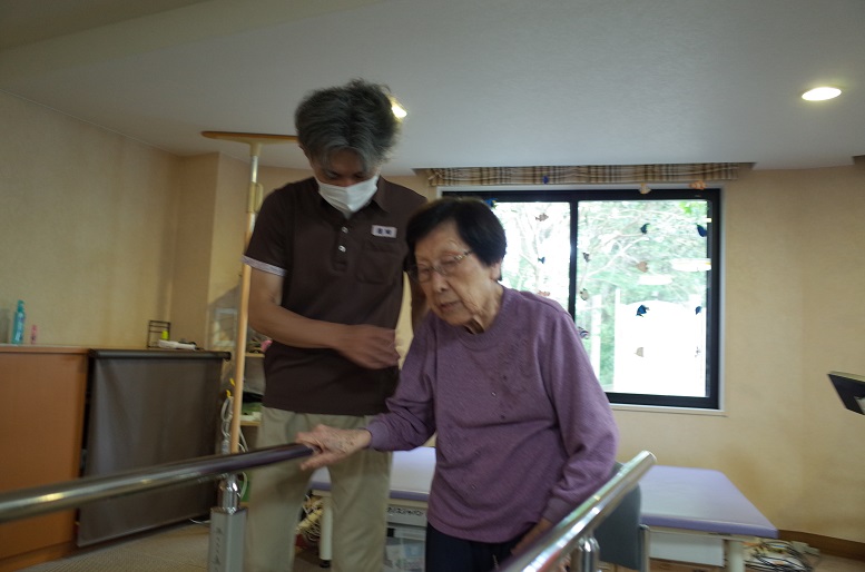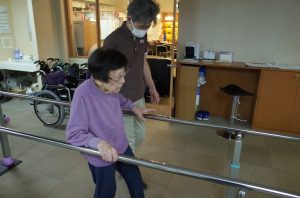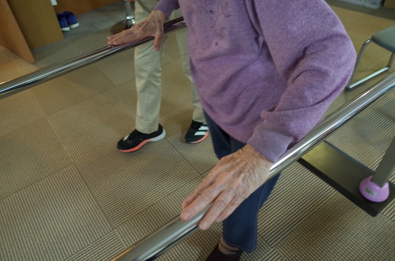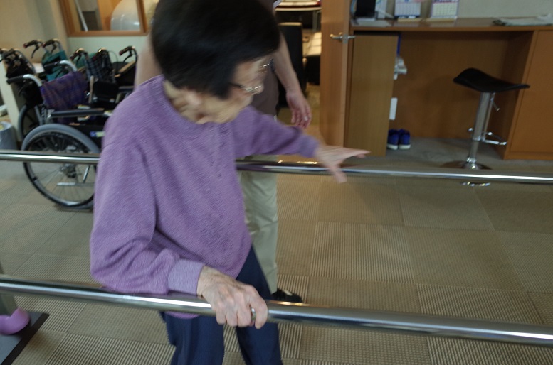 ●平行棒を両手で掴まず、手を開いた(パーの状態)での歩行訓練。