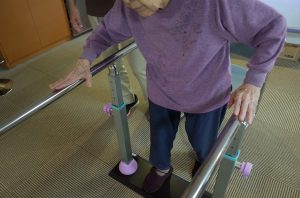 ●片手のみ平行棒を掴みながらの歩行訓練。