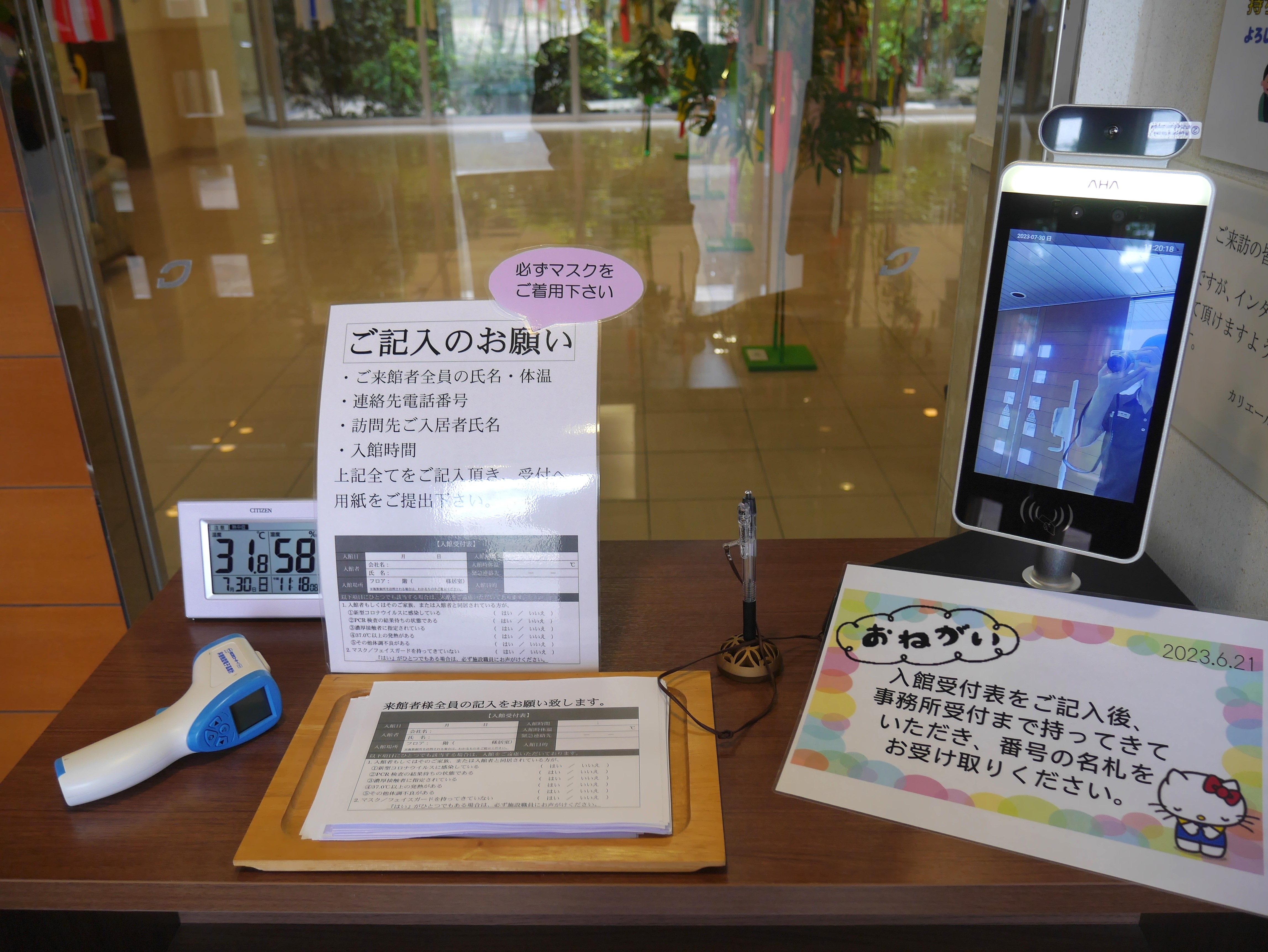 玄関を入ると、検温、手指消毒をしていただく場所がございます( •̀ ω •́ )✧