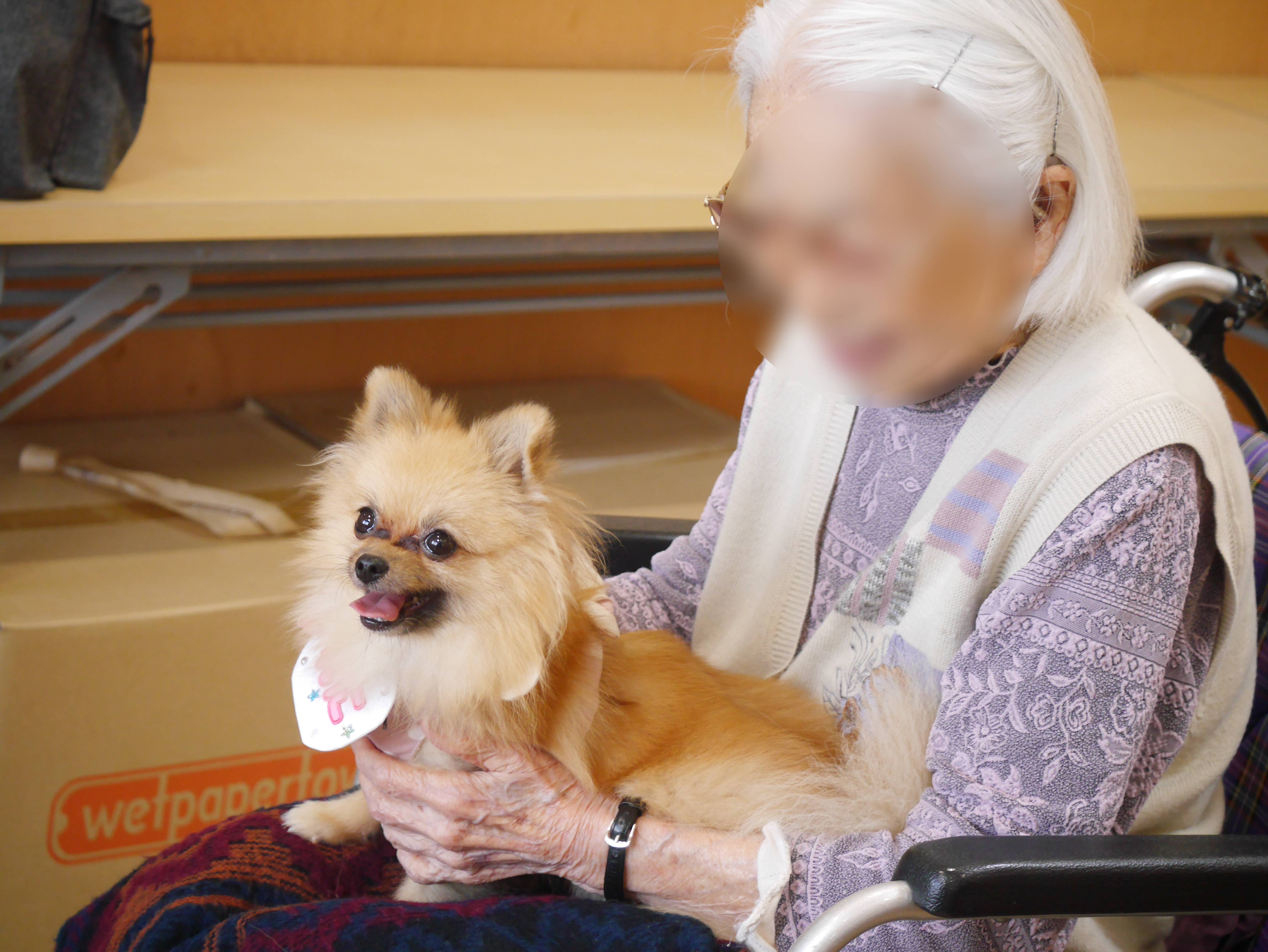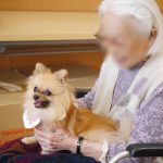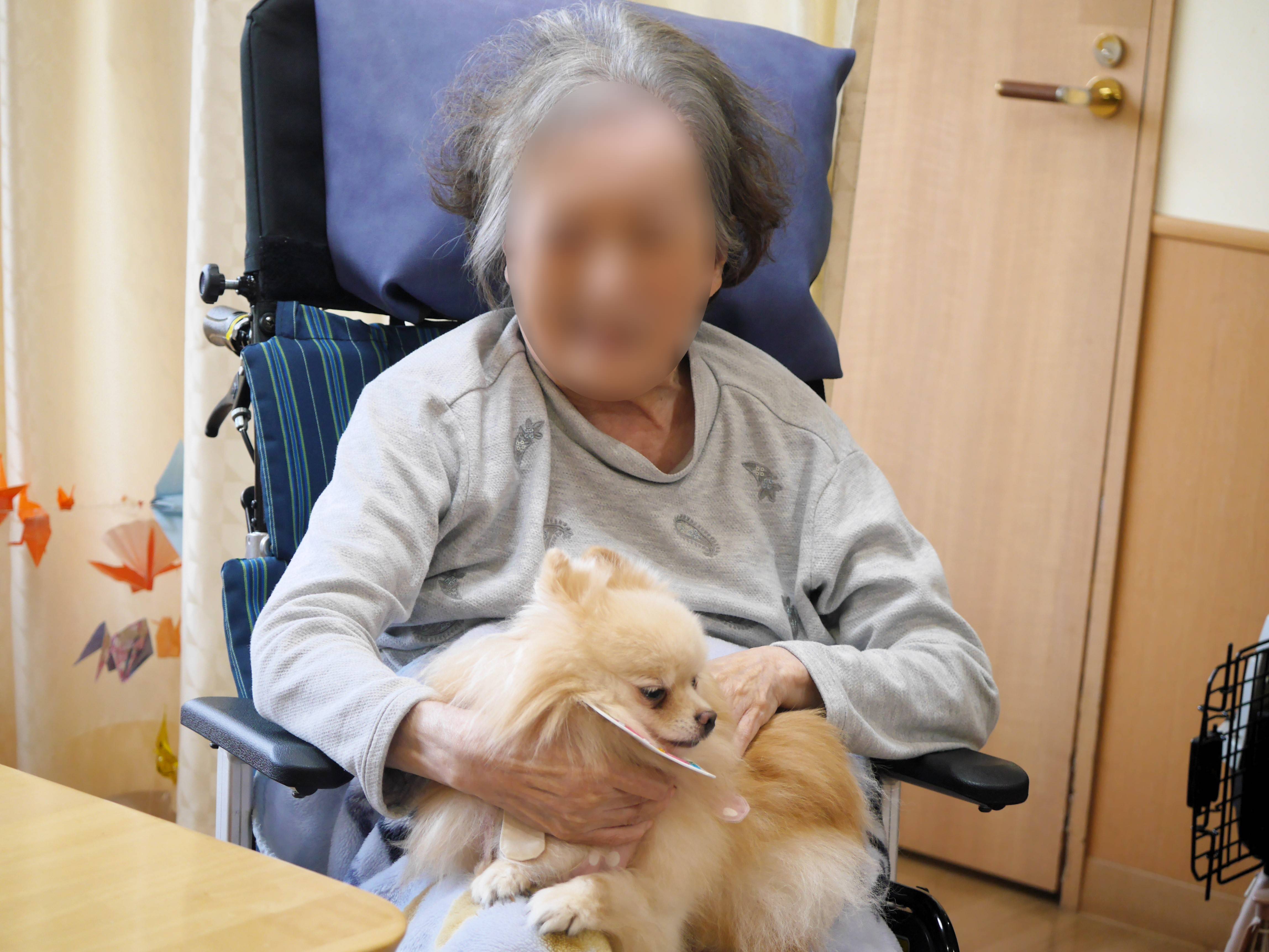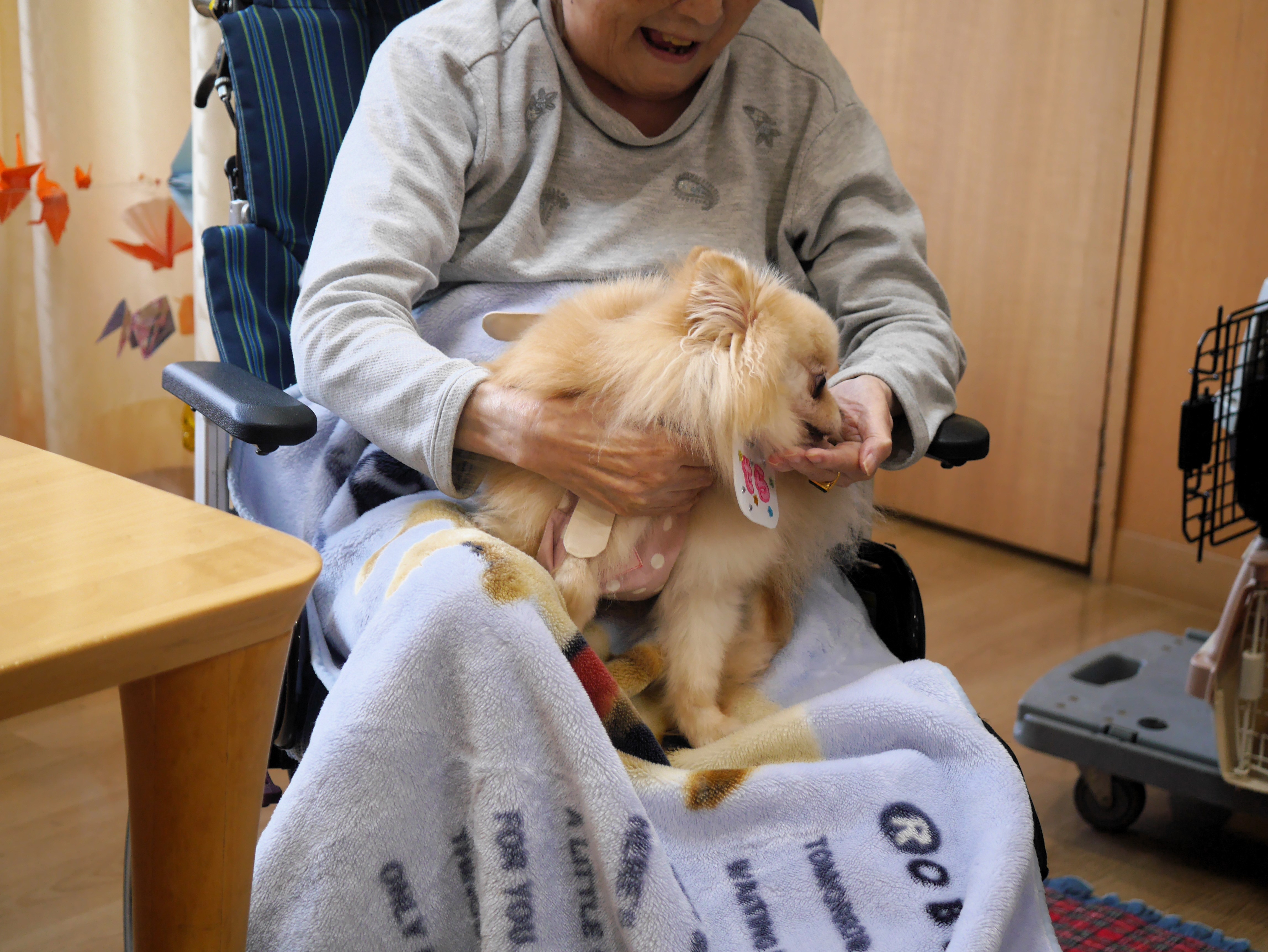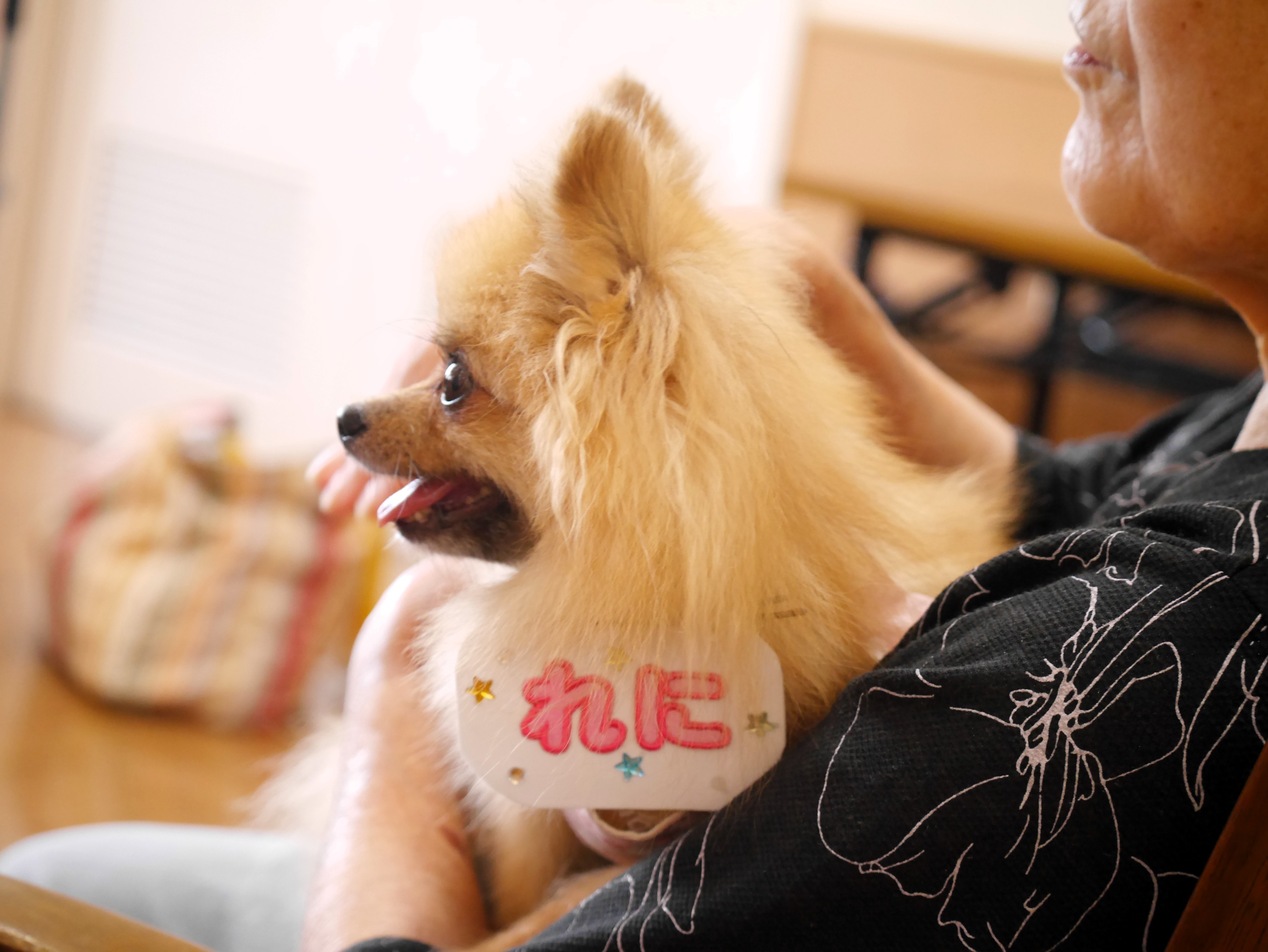 入居者様のお膝の上でニコニコの『れにちゃん』と