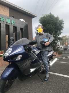 バイクにまたがり、片手ヘルメット姿ががバイカー感あふれています!!