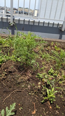屋上の朝顔、なかなかつるが出てこなかったのですが、やっと手を伸ばし始めてくれました。