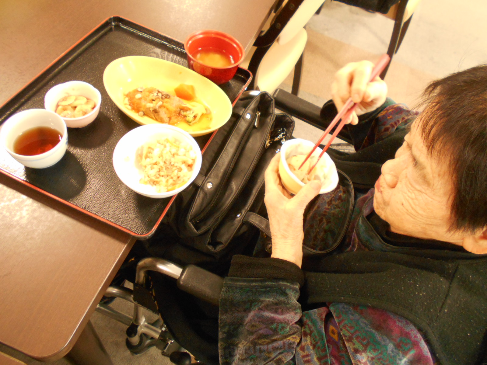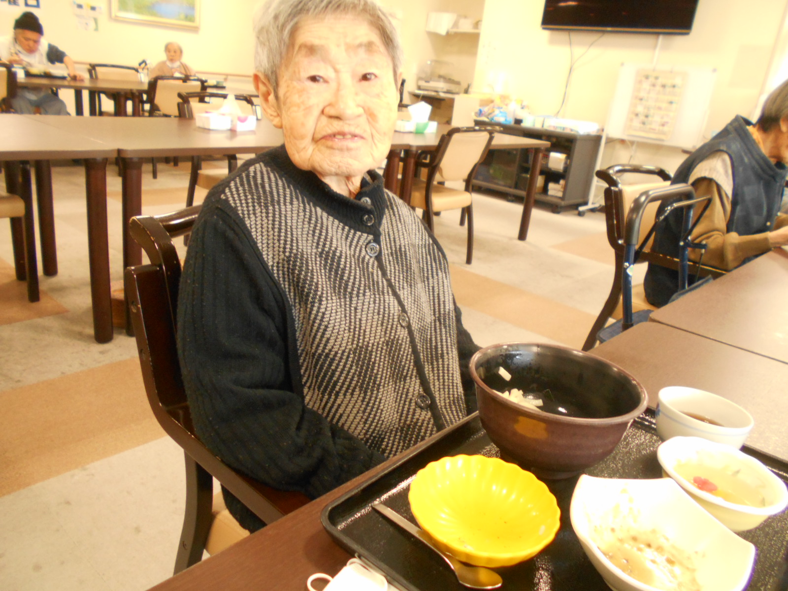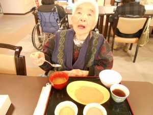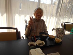Hさん 味噌汁を飲まれ素敵な笑顔を